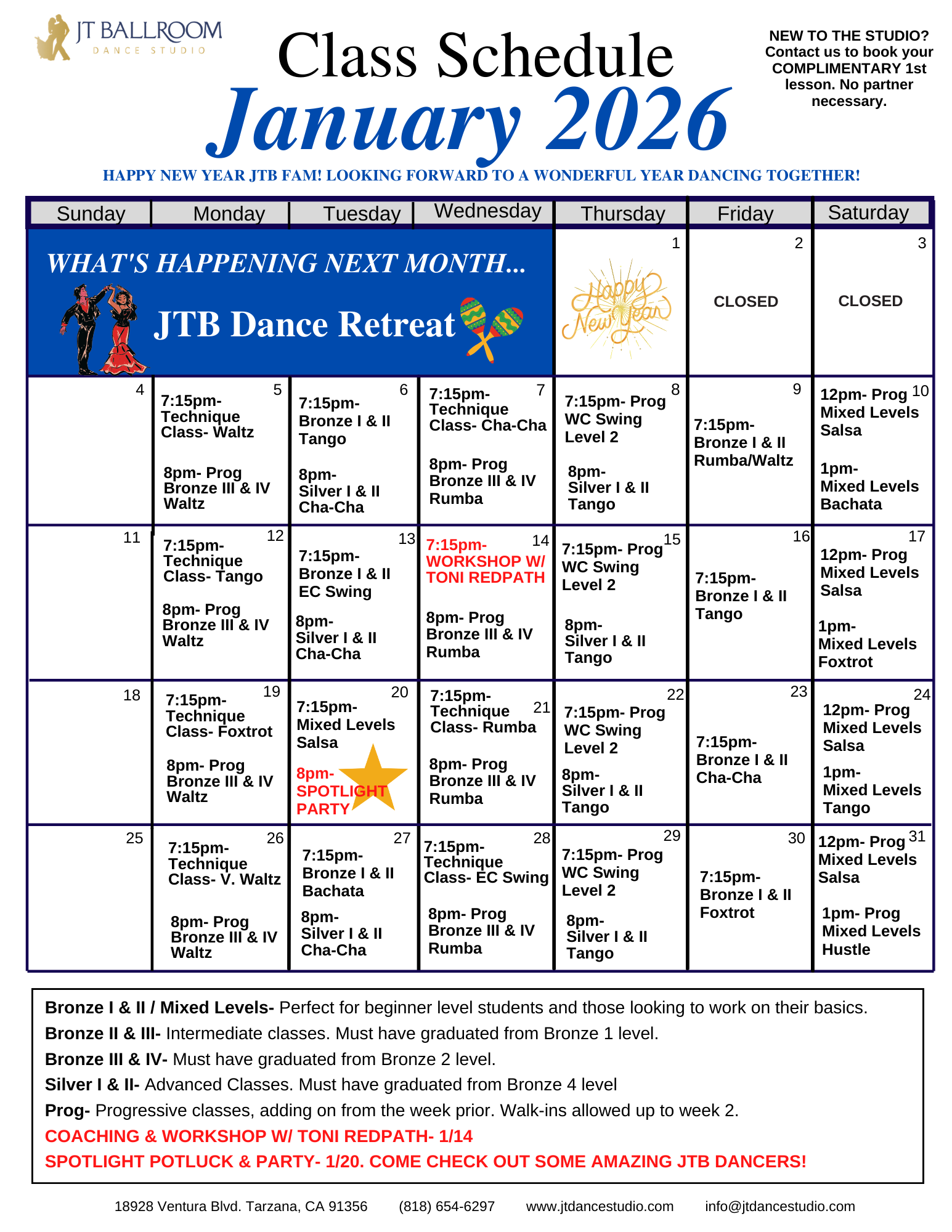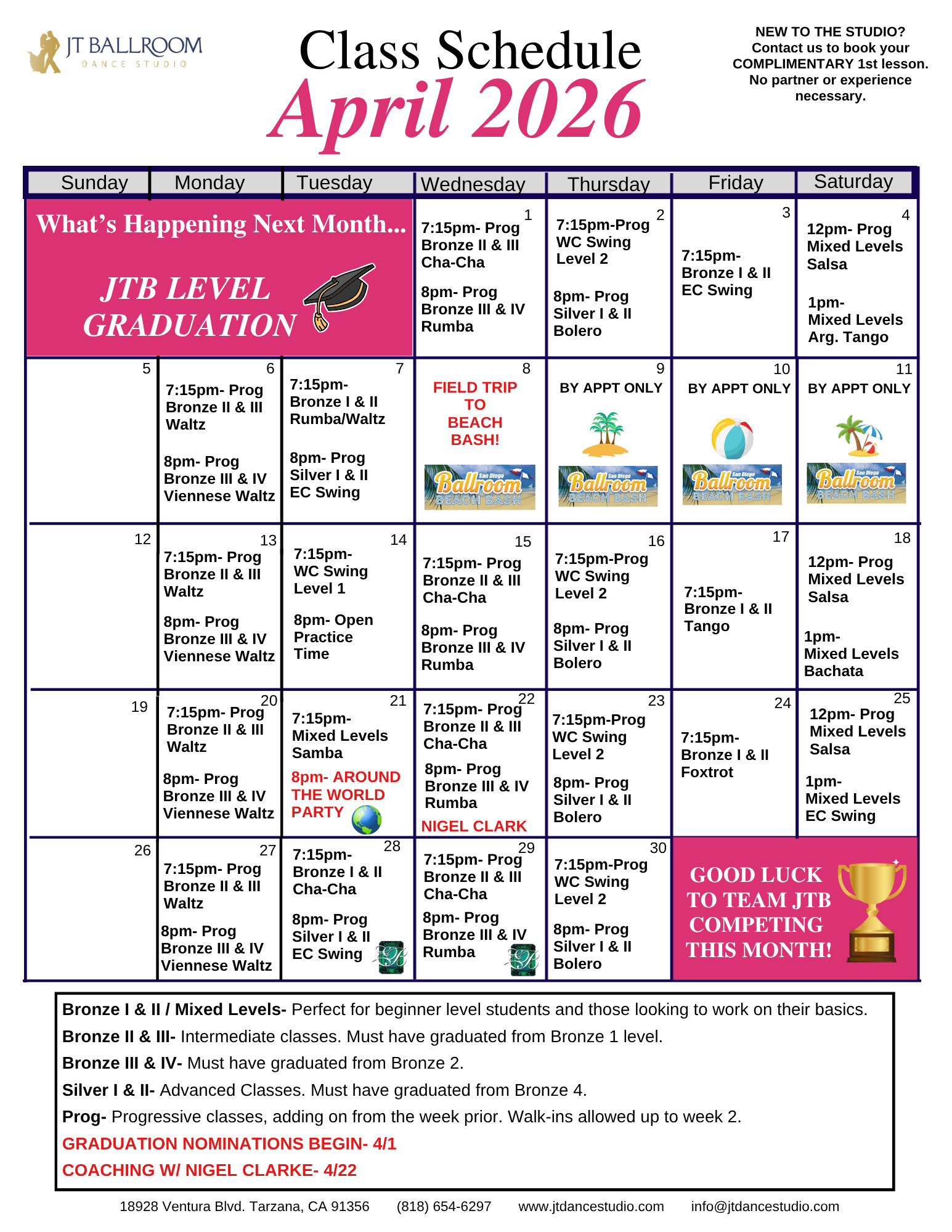 We offer many group classes throughout the week! Coming to group classes regularly as a refresher is an integral part of learning to dance. They provide a comfortable place for you to practice what you learned in your private lessons, learn new steps, strengthen your lead/follow abilities, and also a great way to meet fellow JTB students. Partner not required.